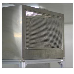 整體采用SUS304不銹鋼材料制作,利用大功率風(fēng)機(jī)或中央空調(diào)系統(tǒng)進(jìn)行送回風(fēng),溫濕度控制較為方便。過濾器采用液槽密封形式,確保無泄漏。層流罩氣流為垂直單向流,出風(fēng)面可加裝均流膜,風(fēng)速在0.36-0.55m/s,可通過煙霧測試證明單向流狀態(tài)。層流罩上安裝PAO發(fā)塵口,PAO上游采樣口,可對每臺過濾器進(jìn)行現(xiàn)場檢測。層流罩隔離裝置采用防靜電PC板或防靜電軟簾。