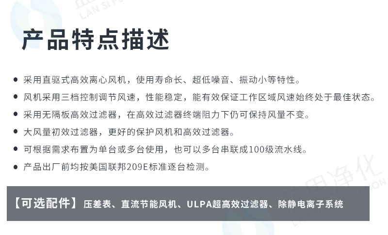 產(chǎn)品出廠前均按美國聯(lián)邦209E標(biāo)準(zhǔn)逐臺檢測。