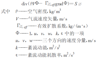 從流動(dòng)的雷諾數(shù)來考慮, 潔凈車間的氣流均為紊流[ 1] , 空氣的流動(dòng)滿足連續(xù)性方程、動(dòng)量方程和能量方程。對(duì)于工程問題, 我們不需要關(guān)心紊流的精細(xì)結(jié)構(gòu)及其瞬時(shí)變化, 而只關(guān)心紊流隨機(jī)變量的有關(guān)平均值, 因此, 本文采用雷諾時(shí)均方程紊流粘性系數(shù)法, 流動(dòng)模型采用暖通空調(diào)廣泛采用的標(biāo)準(zhǔn)k -ε二方程模型, k -ε模型通過求解紊流動(dòng)能與紊流動(dòng)能耗散率的輸運(yùn)方程得到紊流粘性系數(shù)。